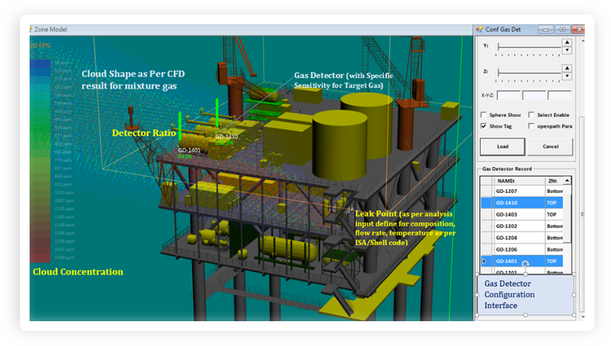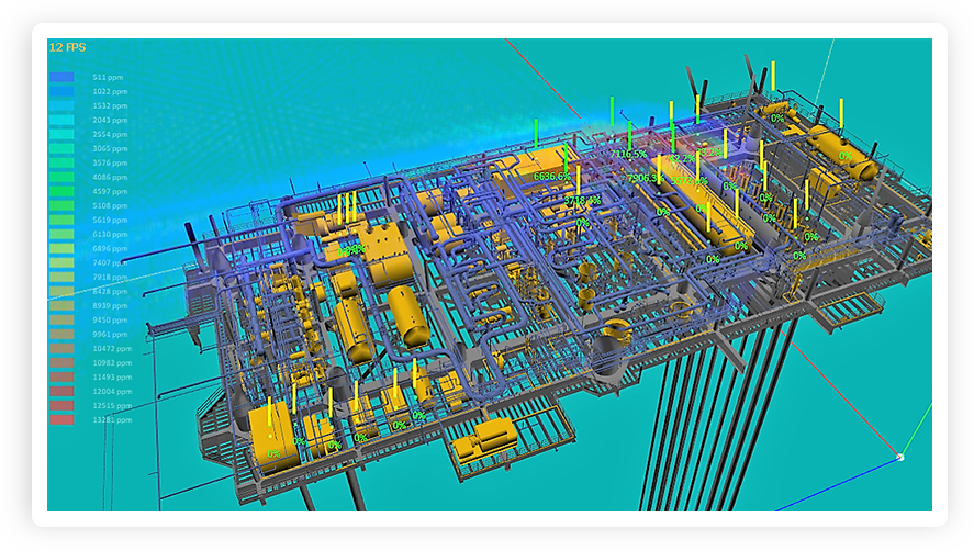 GCV分析软件协助设计师计算出气云浓度比对气体探测器探测性能即灵敏度的比率, 以此来了解探测器组合配置对于气云捕获情况的效果。工程师或设计师需要根据比对的结果对探测器设计作进一步的调整。